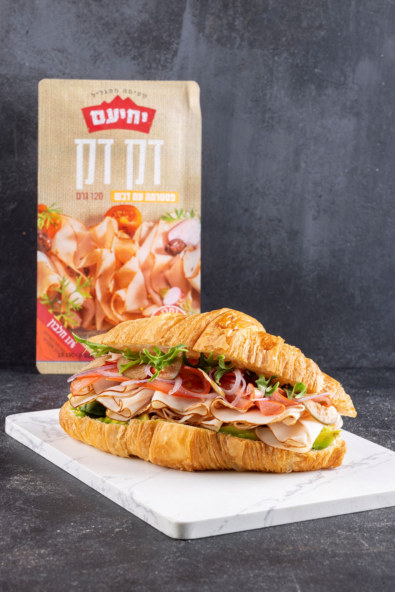 במיוחד: כריך קרואסון עם פסטרמה בדבש, אבוקדו וירקות טריים. קרואסון